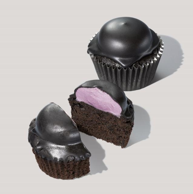 真っ黒なカップケーキを割ると、中から甘酸っぱいブルーベリークリームが出てきます。どっしりとした味わいのブラックココア生地とさわやかなブルーベリークリームのバランスが絶妙です。