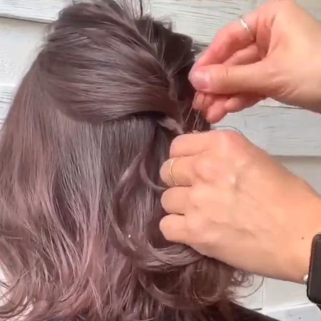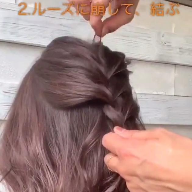 できあがった編み込みをルーズに崩し、ゴムで結びます。