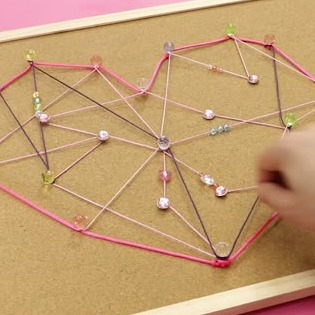 さらに画びょうの数を増やして、ひもが交差するようにランダムに巻きつけていきます。余力がある方は、ひもにビーズを通しながら巻くと、写真を飾っていない部分もキュートになりますよ♡