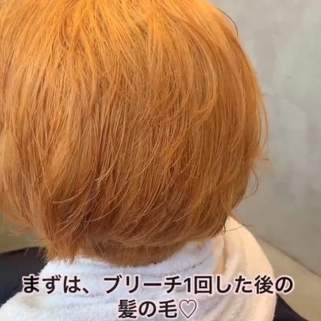 ブリーチ1回だとオレンジのような髪色に。