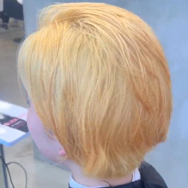 ブリーチを2回して、カラーはなにも入れていない状態がこちら。金髪に近くなり、カラーを入れなくてもきれいな色です。