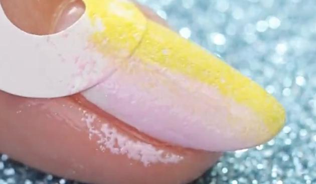 黄色、ピンク、ブルーの3色のマニキュアをスポンジに塗ります。このとき、縦に塗ると縦グラデ、横に塗れば横グラデに♡