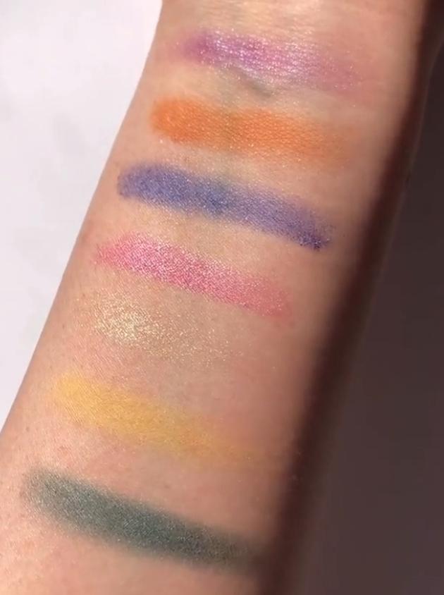 カラフルなパレットの1色ごとの発色はこんな感じ。一見奇抜な色に見えますが、普段のメイクにカラーを1色ポイント使いすれば、気分の上がるお出かけメイクになりますよ!