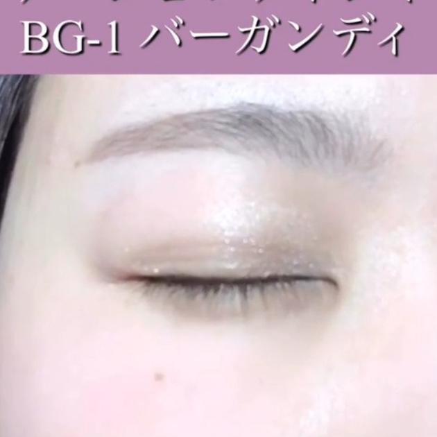 バーガンディの仕上がりはこんな感じ。発色やラメ感が◎かわいいメイクも大人っぽいメイクも叶います。世代を問わず使える落ち着いたピンクですよ。