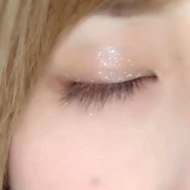 ライトピンクの仕上がりはこんな感じ。使いやすい甘いピンクが涙袋にもぴったり!大粒の多色ラメでうるうるの目元に仕上がりますよ。