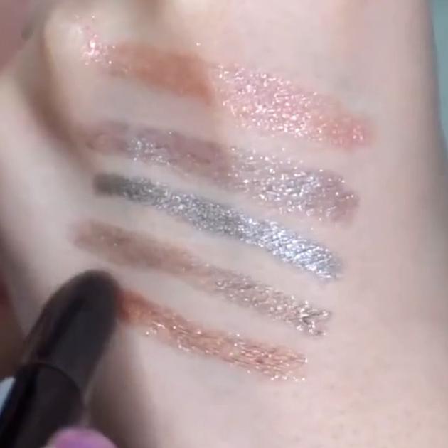上からライトピンク、モーブブラウン、シルバー、ショコラブラウン、ブラウンです。どれも濡れたようなツヤ感がとってもかわいい♡ライン使いもおすすめですよ。