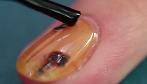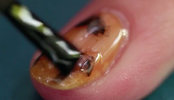 次にべっ甲の柄を作っていきます。「セリア AT濃密グラマラス ネイルエナメル ブラック」を爪の表面にランダムにおきます。筆の先端でポリッシュを軽く擦り付けるようなイメージでのせてください。2〜3箇所くらいにおきましょう。あまりたくさんの場所におかないことがポイントです。