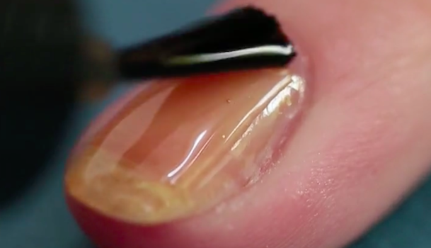 手順1で使った「キャンドゥ TMリキュールネイルパイン」をのせてブラックの部分をぼかします。ブラックが乾かない段階でシースルーのイエローをのせることでより自然にぼかすことができますよ。使用した筆はしっかりブラックの色味を取り除いてから瓶に戻しましょう。