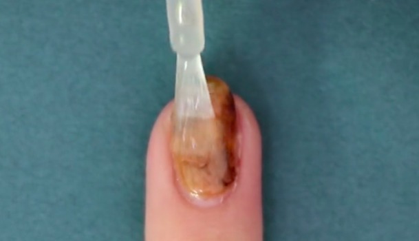 まずはじめにベースコートを塗り、爪の表面を滑らかに整えておきましょう。次に、「キャンドゥ TMリキュールネイルパイン」をベースカラーとして塗ります。透け感を残しつつ色をしっかり付けたいので、爪全体にまんべんなく塗ってください。