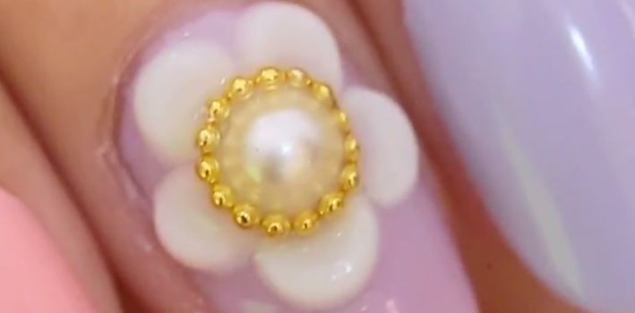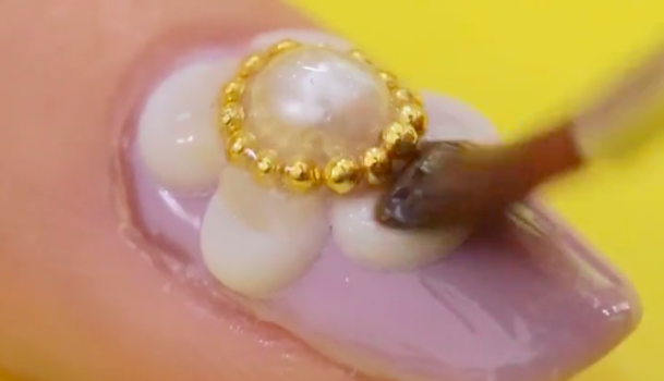 大花の中心部分にトップジェルを塗り、ピンセットを使ってパールをのせます。次に、パールの上からトップジェルを塗り、木の棒を使いながらパールを囲うようにしてブリヲンをのせます。この時のトップジェルはパーツをのせるためのノリのような役割をしてくれるんですよ。