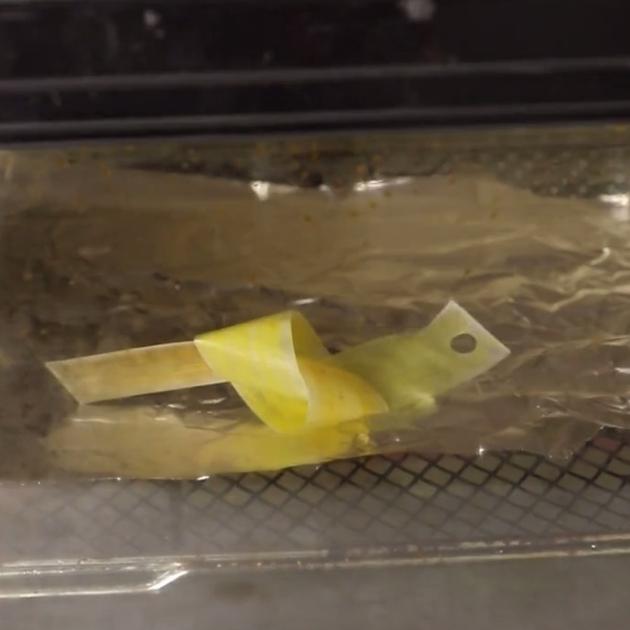 プラ板が画像のように少し歪んできたら、ひっくり返してもうしばらく焼きます。