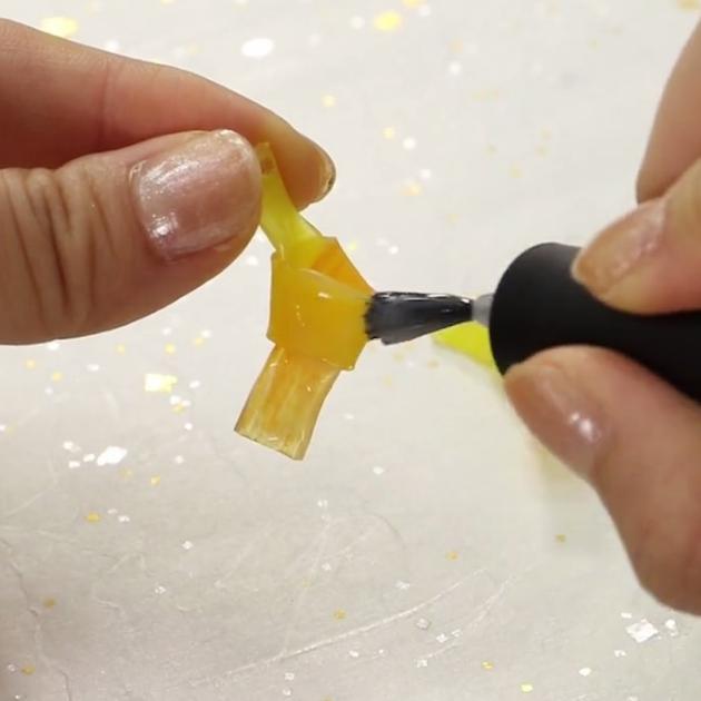 オーブントースターからプラ板を取り出し、表面にリキュールネイルを塗っていきます。
