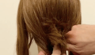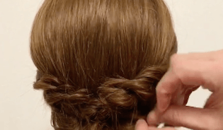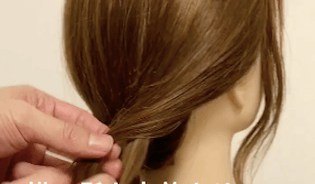左右ともに耳後ろの髪をとり、後ろでくるりんぱをしましょう。手順1でとった毛束より少し下の位置になります。