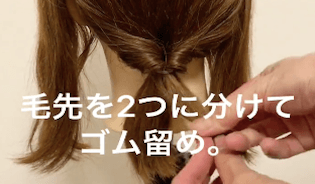 くるりんぱした毛先を2つに分け、それぞれ細めのゴムで留めます。
