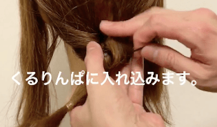 手順2でできた2つの毛束を、手順1で作ったくるりんぱの中に入れます。上から入れていきます!