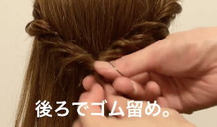 手順1で交差させた毛束を2つまとめて、後ろでゴム留めします。