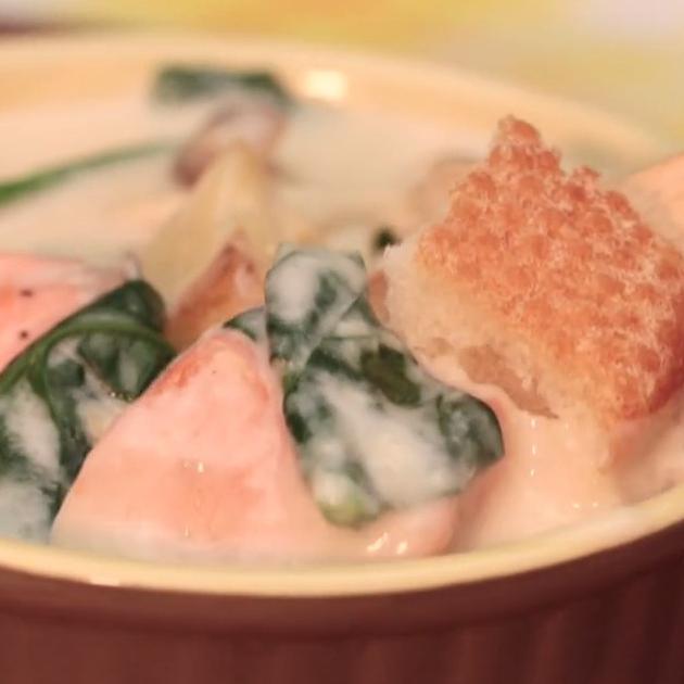サーモンの入った洋風鍋レシピ。クリーミーなチャウダーが優しい味です♪バゲットと一緒に食べるのもおすすめ。