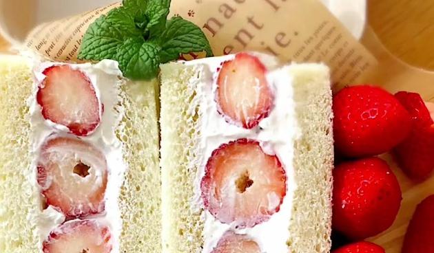 3.生クリームを重ねラップに包み、お弁当にしたときにいちごの断面がきれいになるようにカットしたら完成!