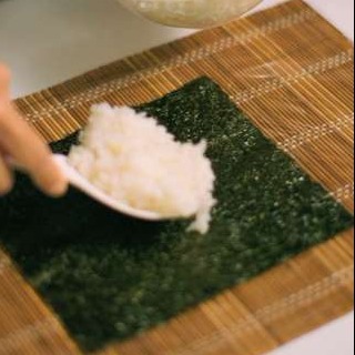 ラップの海苔を敷いて、その上にご飯をのせます。