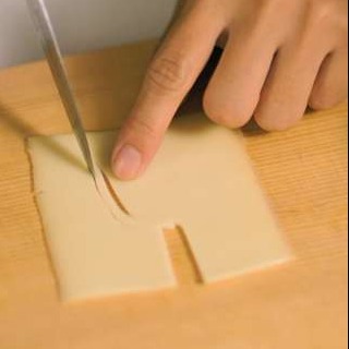 包丁は鉛筆を持つようにするのがポイント。チーズで目と口とマスクの淵、海苔で口の縦線を作ります!