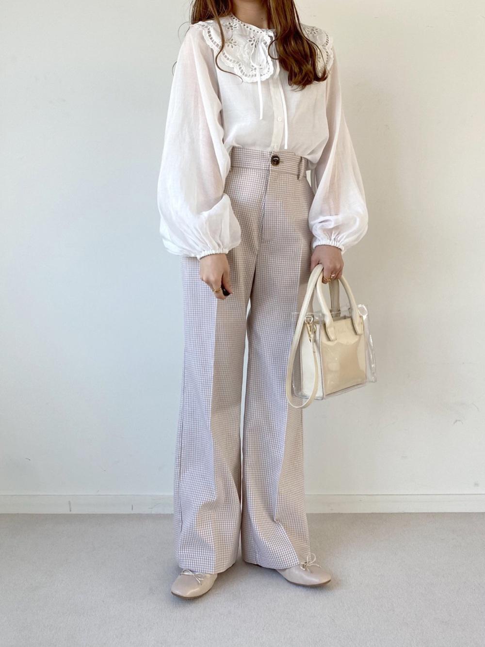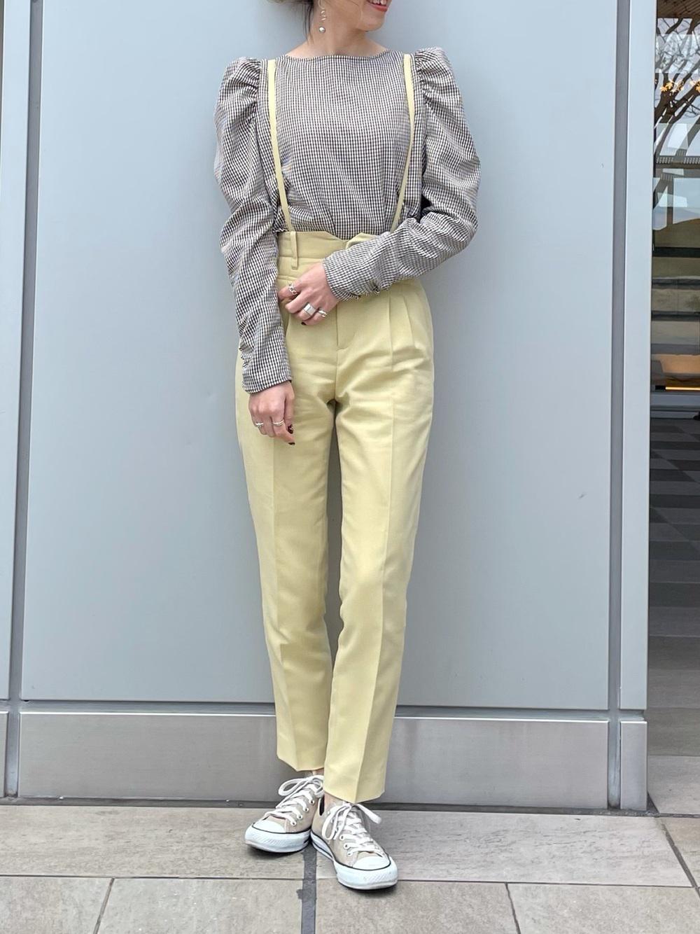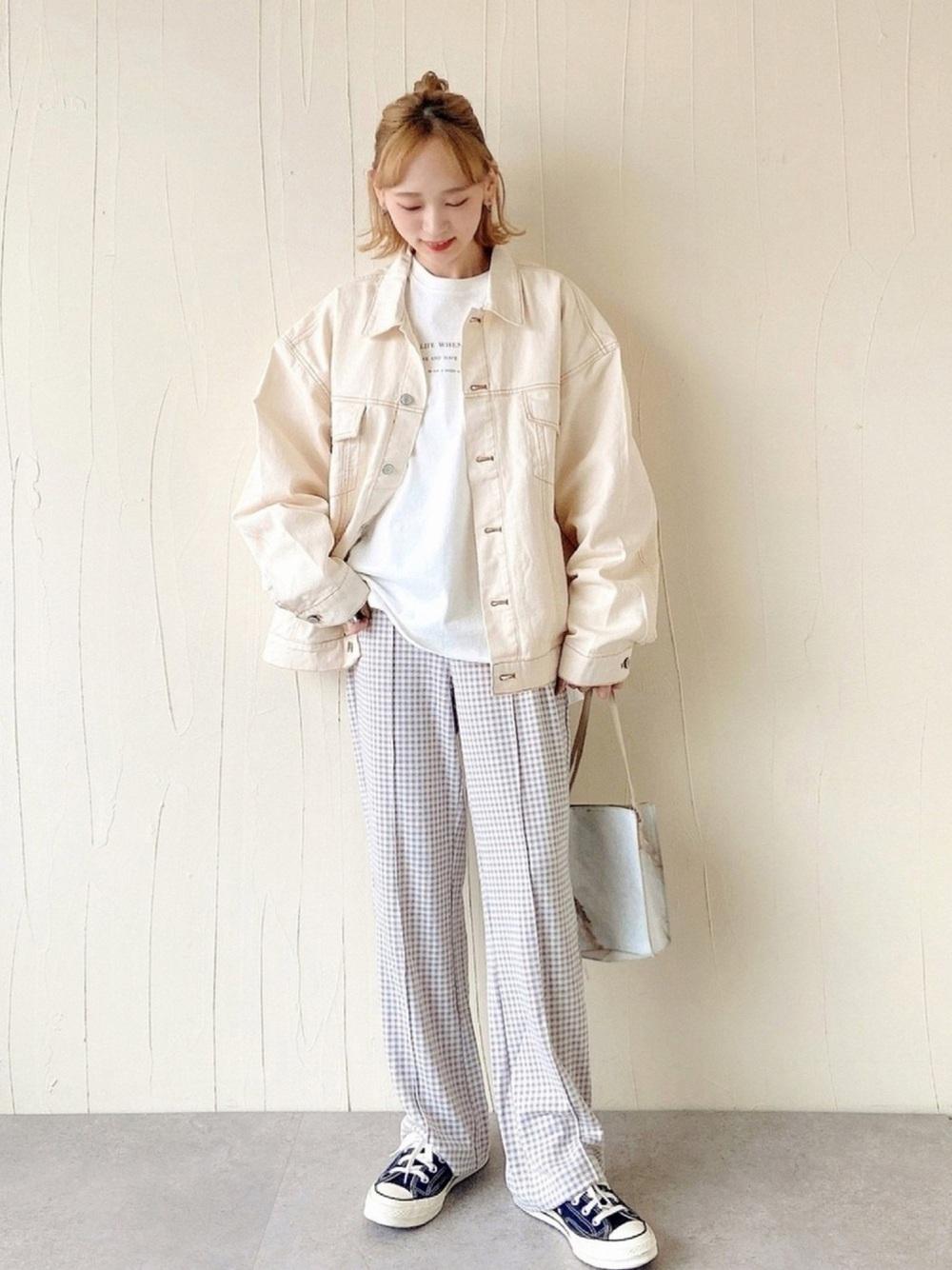 小柄のギンガムチェックシャツにパステルカラーのパンツを合わせて、春を感じるコーデに。どんなカラーでも合わせやすいのが黒のギンガムチェック!