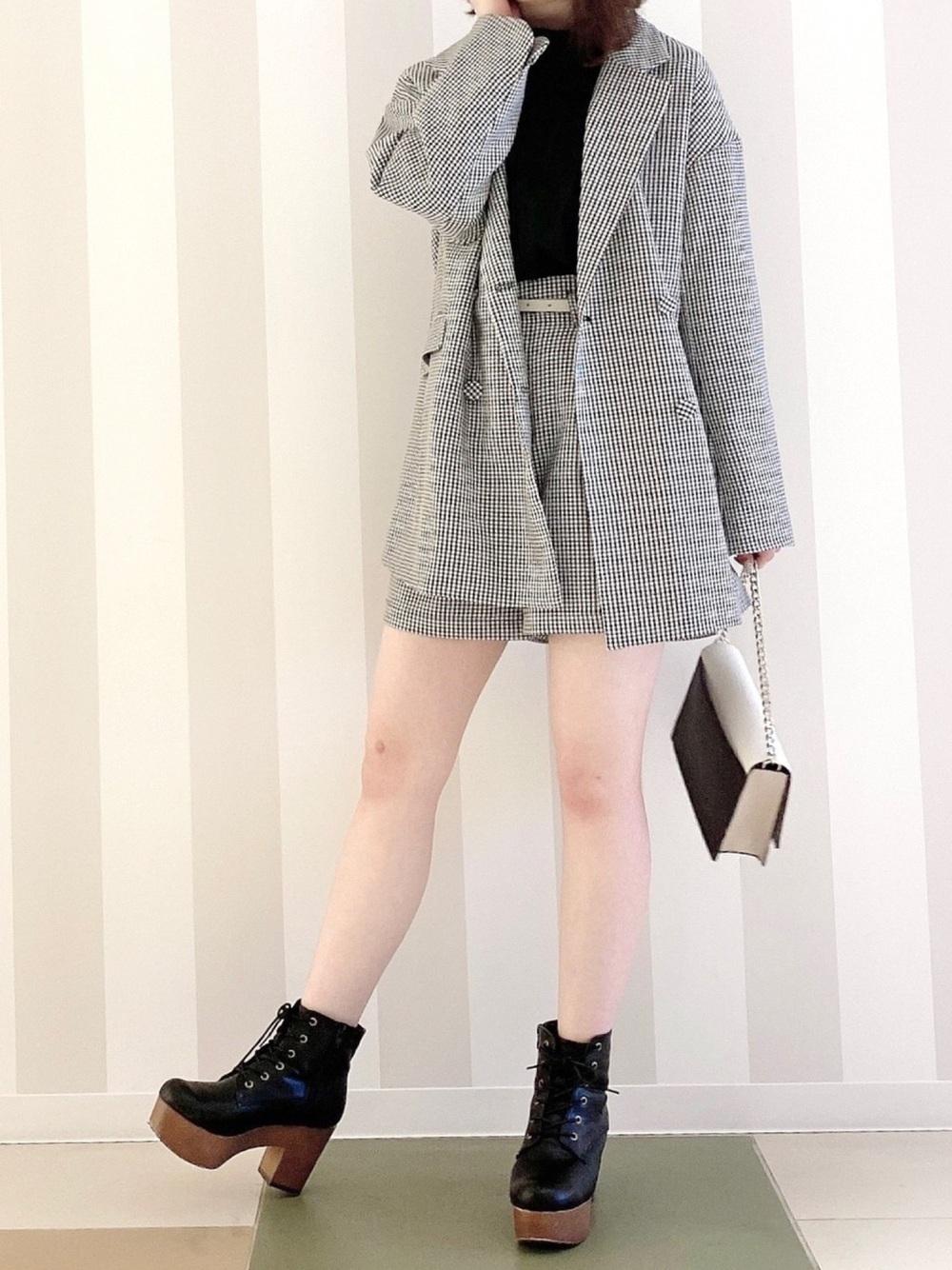 黒でまとめたジャケットセットアップコーデ。ギンガムチェックが入っていることで、黒だけど重すぎないおでかけコーデになりますよ!