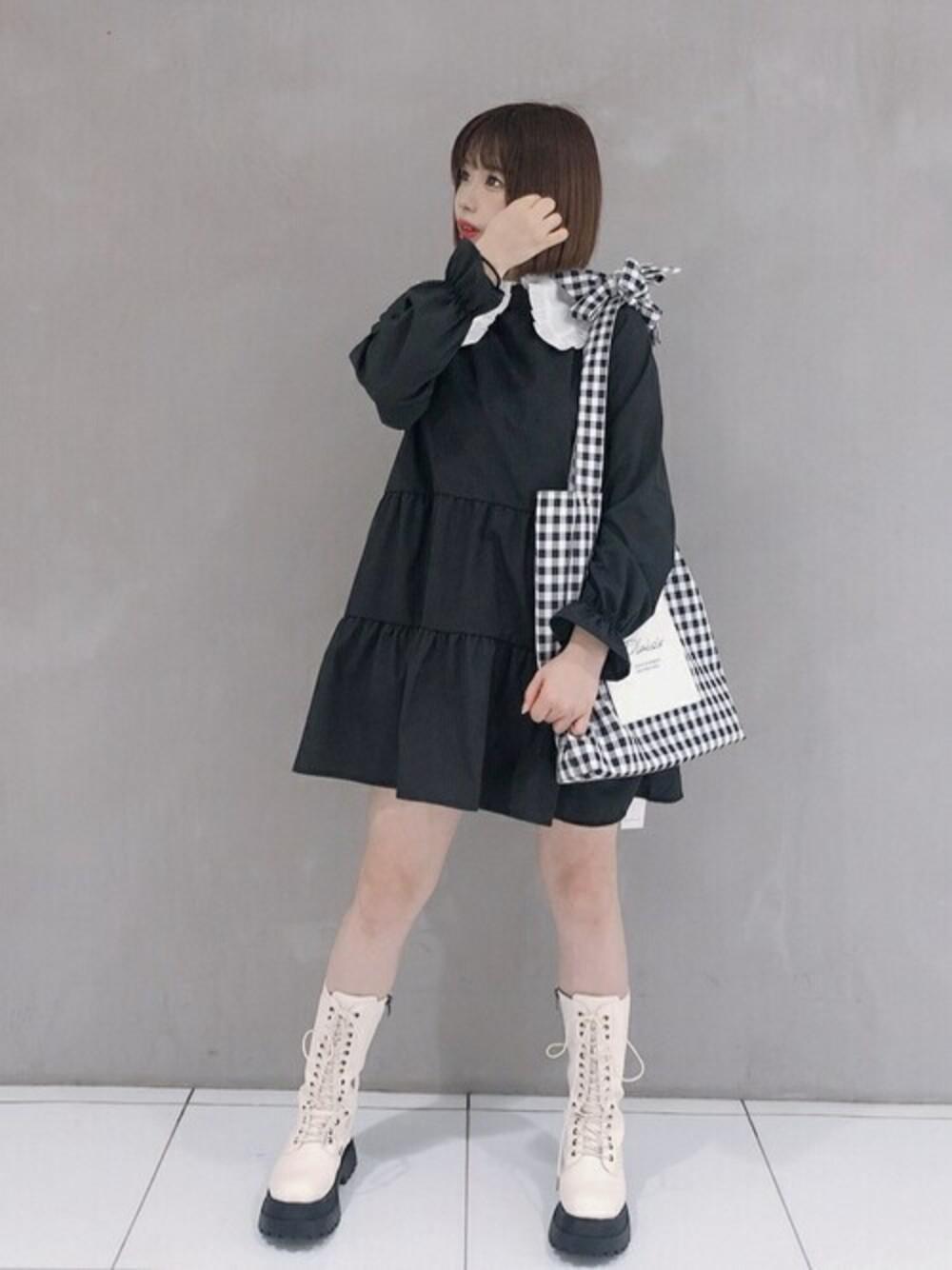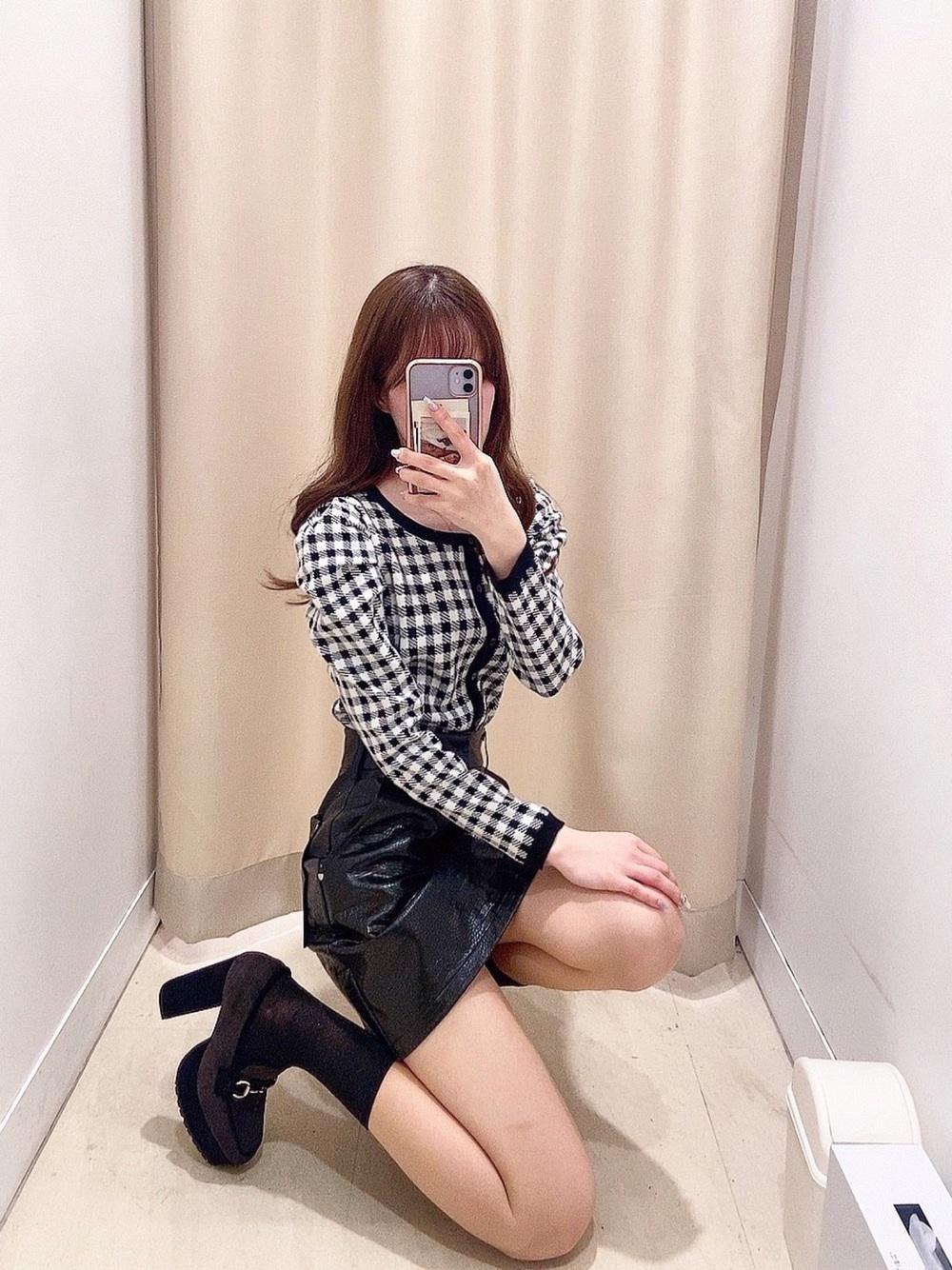 大胆で目を引く大柄ギンガムチェックシャツにタイトなミニスカートを合わせて、とことんかわいらしく♡だけど、落ち着いた黒で統一しているので大人っぽさも見せることができます。