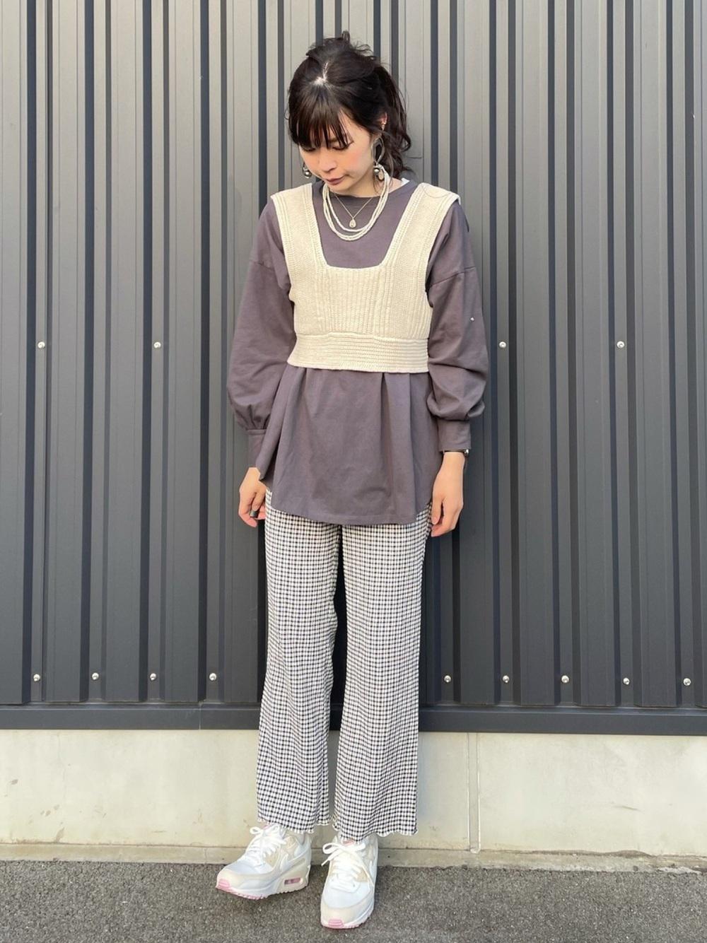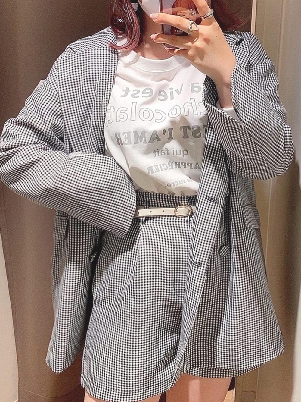 ギンガムチェックのセットアップの中に白のロンTを合わせてカジュアルダウンもできます◎