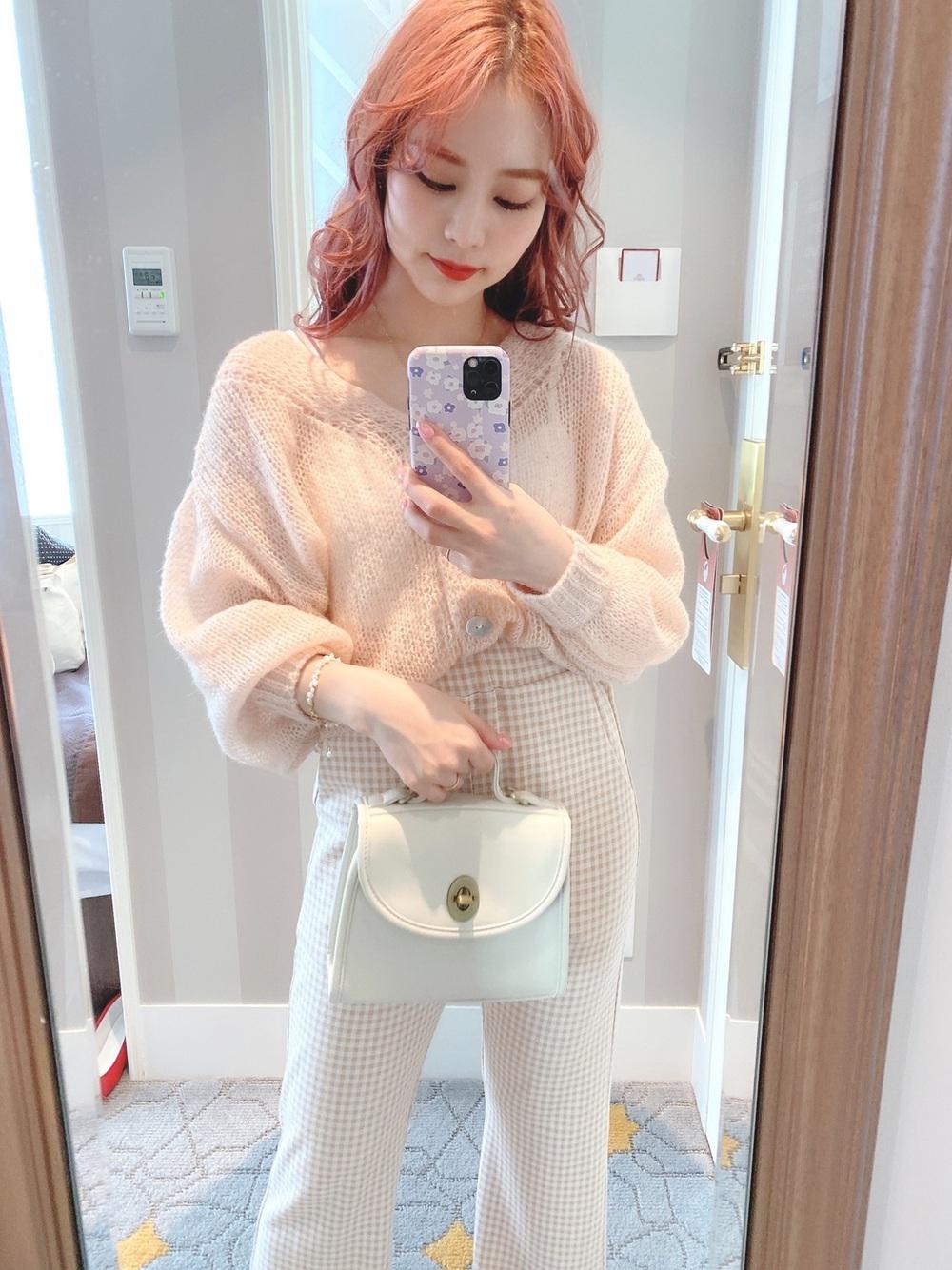 全体的にトーンが統一されたこなれ感たっぷりのコーデ。春らしいパステルピンクを取り入れてかわいらしさを出しながら、タイトめなチェックパンツで大人っぽさとのバランスを◎