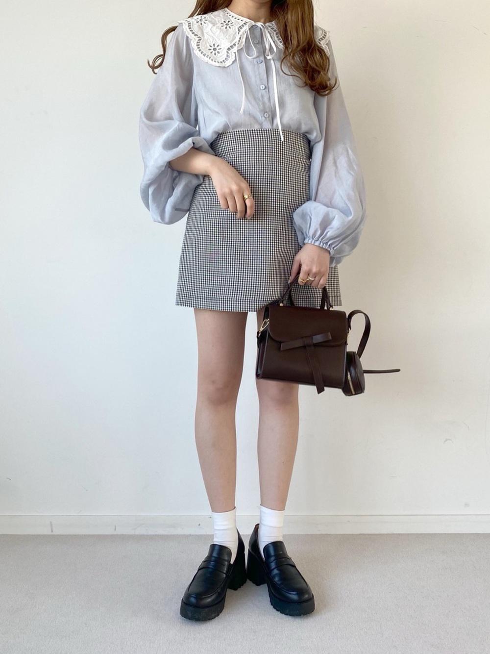 襟付きブラウス×ギンガムチェックスカート×ローファーでレトロ風にかわいく♡ふんわりとやわらかい印象を作ることができます。