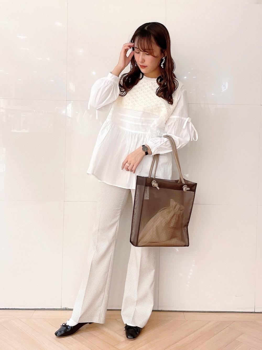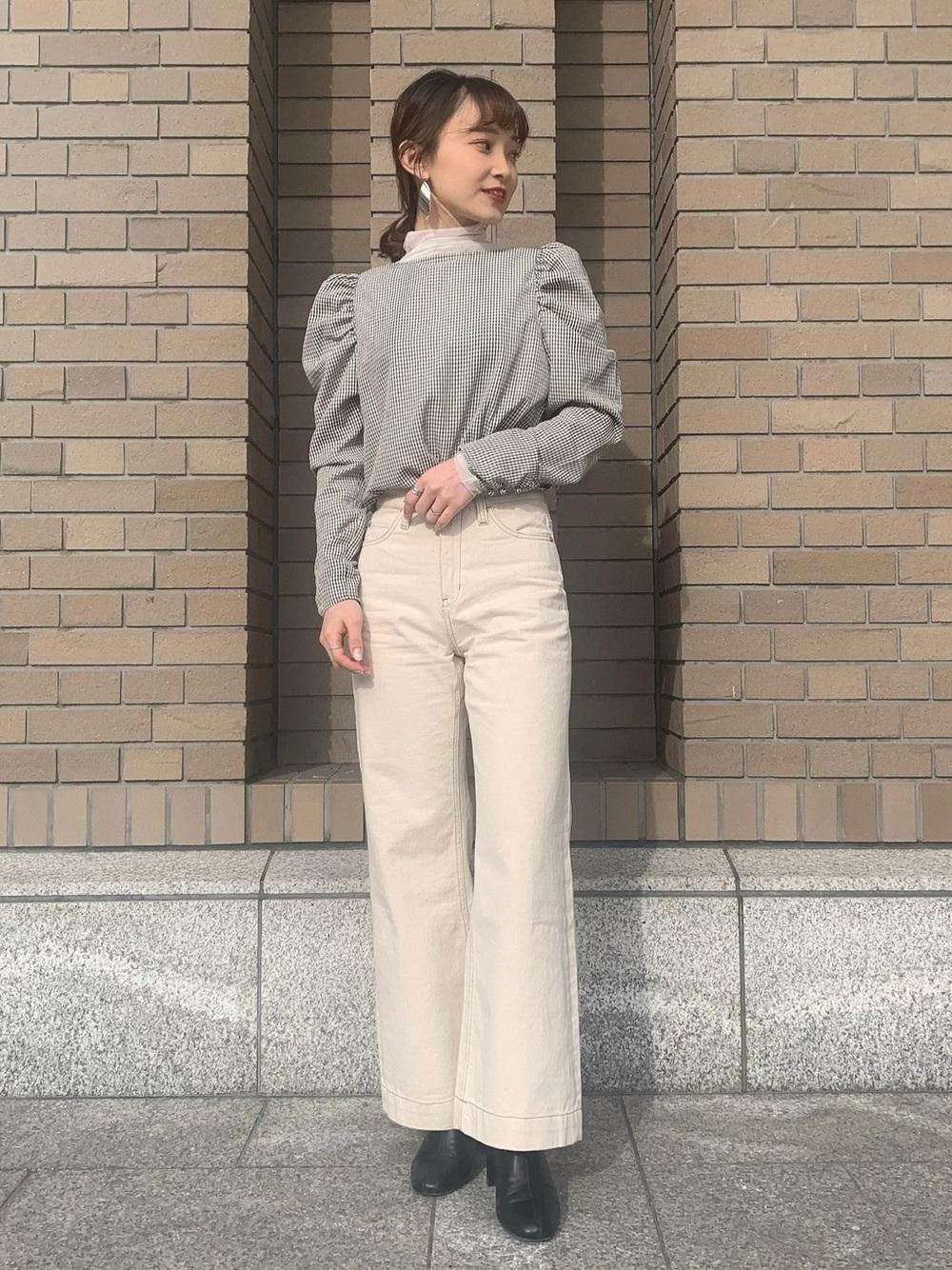 そでがふんわりとしたパフブラウスでゆるっとしたかわいさを♡そして色味に統一感を出すことでバランスのとれたおしゃれコーデに。