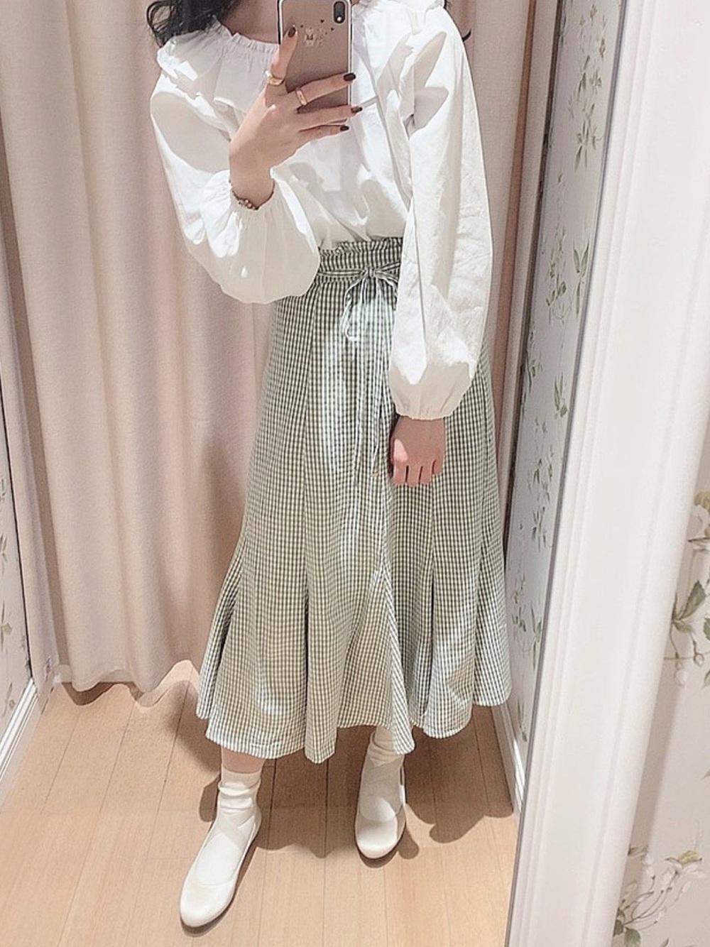かわいらしい雰囲気を出したいなら白のブラウスにパステルグリーンのギンガムチェックを合わせてみて♪