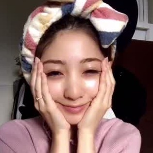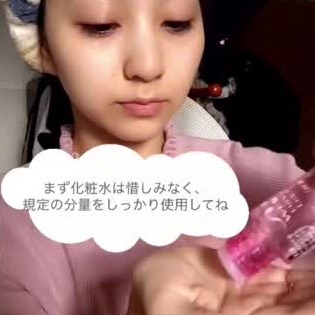 化粧水を顔全体につけます。リフトアップするように、下から上へつけましょう。