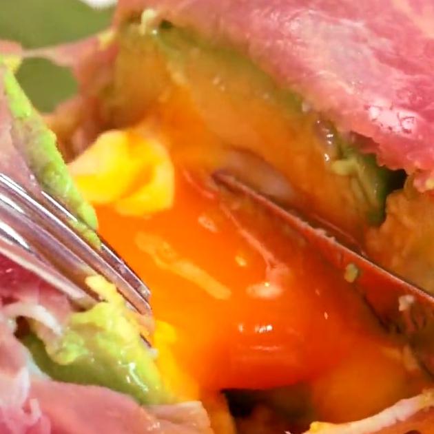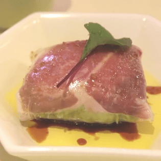インパクト大なこちらは、アボカドと温玉を生ハムでくるりと巻いたボリューム満点のおかず。ナイフで切ると、中からとろーり卵が出てくるというなんとも嬉しい一品です♪