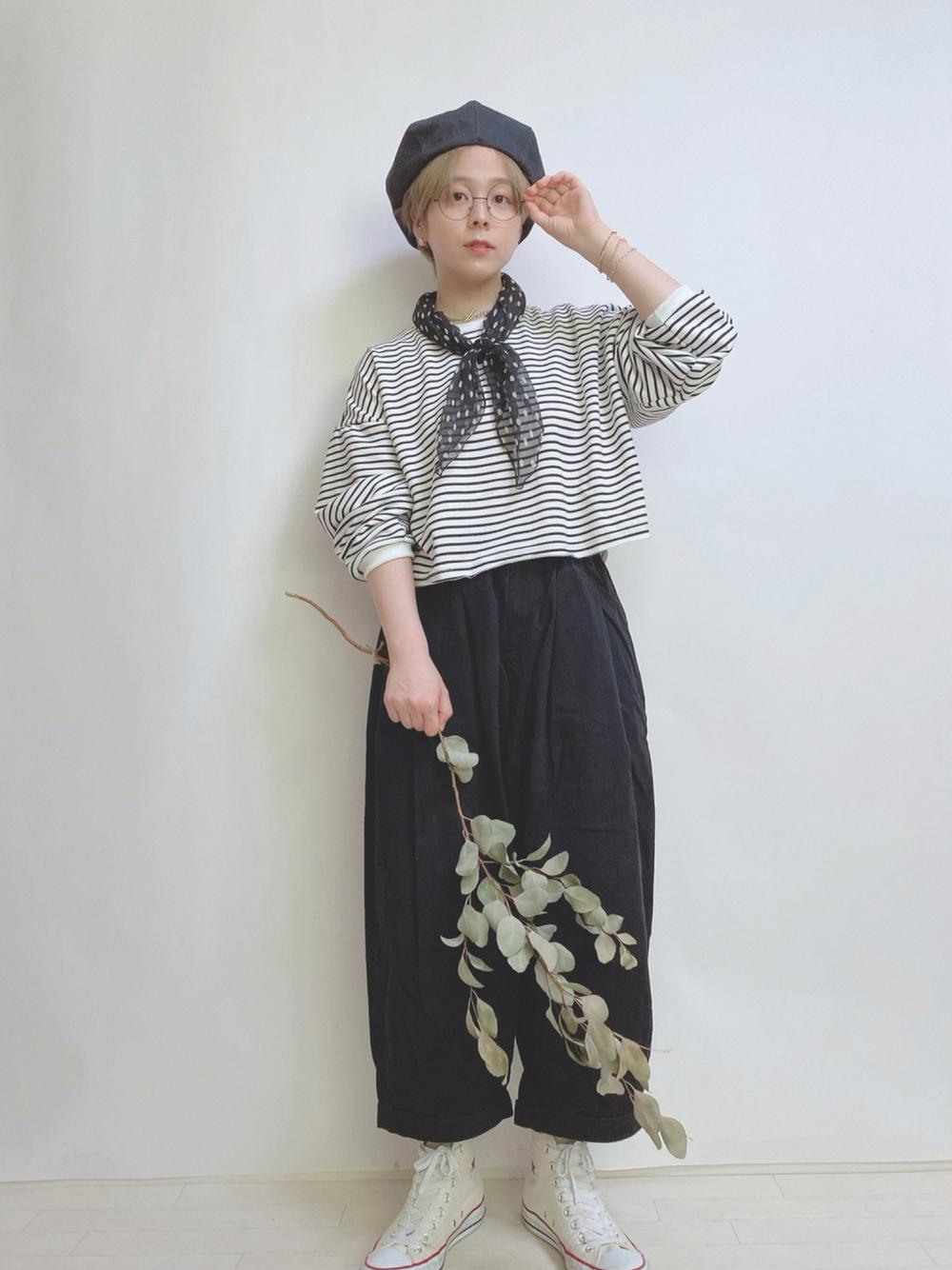 ボーダーのTシャツとスカーフをあわせたマリンボーイッシュコーデ♪