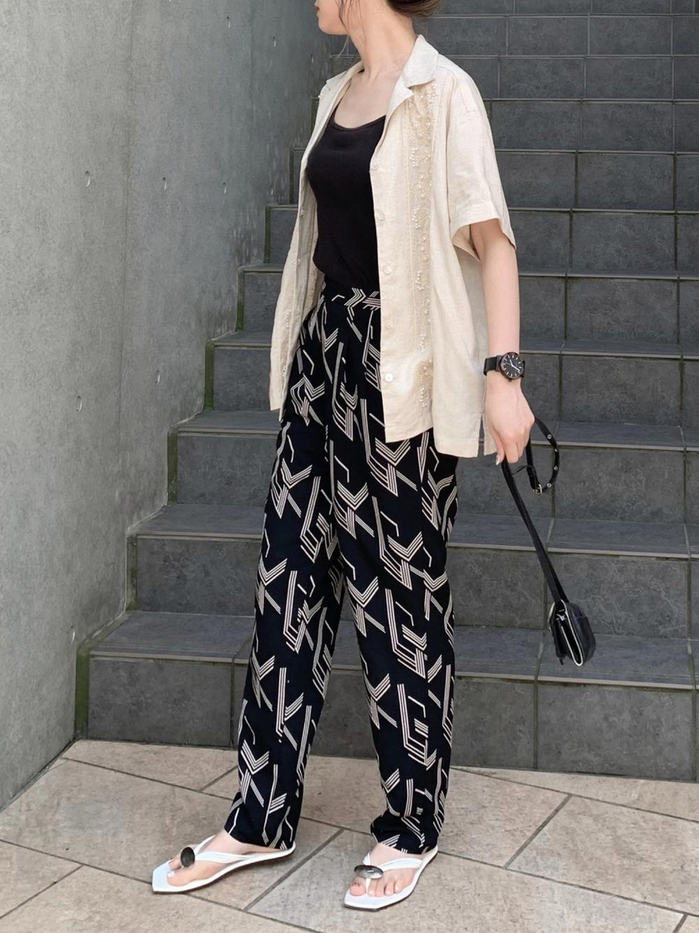 難易度高めに見える柄パンツも、落ち着いた色味を使うことで派手になりません◎トップスには、リネン生地の淡い色味のシャツを羽織ることで、重たくならずこなれた印象に♡