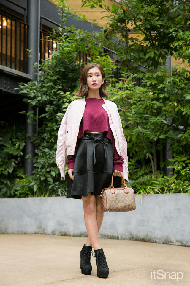 スニーカーとボブの外ハネでカジュアル感を出しながら、スカートを着て甘さも足しているこのコーデ。ピンクx黒の色合いで、バランスのいい甘辛スタイルになりますね。
