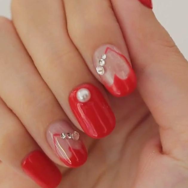 赤を基調としたシンプルネイルあります。ハートやラメを少しづつ使っていて、上品なのでオフィスにも◎