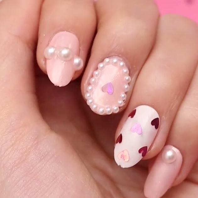 ピンクベースにパールをあしらった派手ネイルは女の子のかわいいをギュッと詰め込んだネイルです。バレンタインだからこそ思いっきりかわいくしちゃいましょう♡