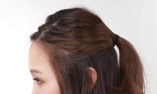 髪をおでこの横ラインの真ん中からとり、浅めにハーフアップをします。