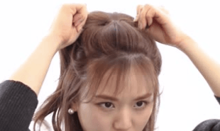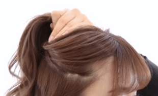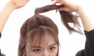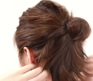 残りの髪を手順1のハーフアップとまとめてお団子にします。画像のように、全ての髪を完全にゴムに通さず、ポニーテール部分が輪っかになるようなイメージで結びましょう。
