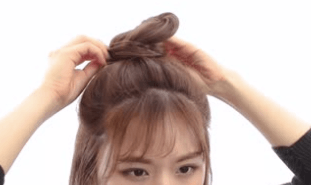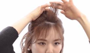 王道メッシーバンといえば、やっぱり高め。お団子をトップにつくることで、顔の印象がパッと明るくなり、キュートに仕上がります。