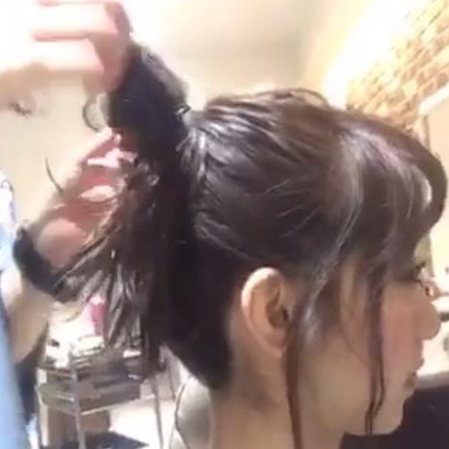 ヘアアイロンを使って、前髪を少しずつ強めに巻いていきます。