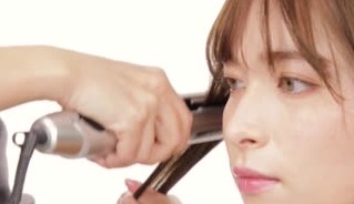 髪の中間あたりをストレートアイロンではさみ、熱を通しツヤを出しながら毛先を外ハネにしていきます。このとき、手首を45度くらいひねるイメージでカールをつけていきましょう。