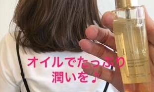 髪全体にヘアオイルをまんべんなく揉み込みます。たっぷり保湿をしたら、清楚系ワンカールスタイルの完成です♡