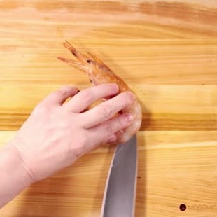 エビは塩水で洗い、水気をふき、頭と尾を残して殻をむき背ワタを取って、背を開く。