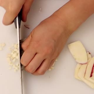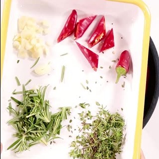ローズマリー、タイム、赤唐辛子は乱切り、にんにくは粗みじん切りにする。