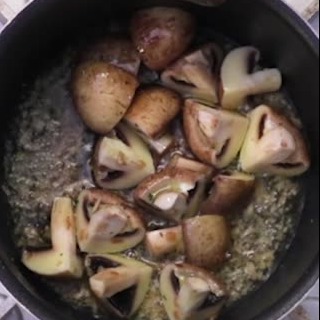 鍋にガーリックオイル、マッシュルーム、塩、胡椒をいれて火にかけます。
