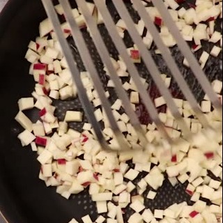 さつまいもは皮をむいて、1cmほどのさいの目状に切って、10分ほど水にさらしておく。これでアクがとれます。