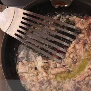 まずは木べらなどで、にんにくをつぶしてバラバラにします。